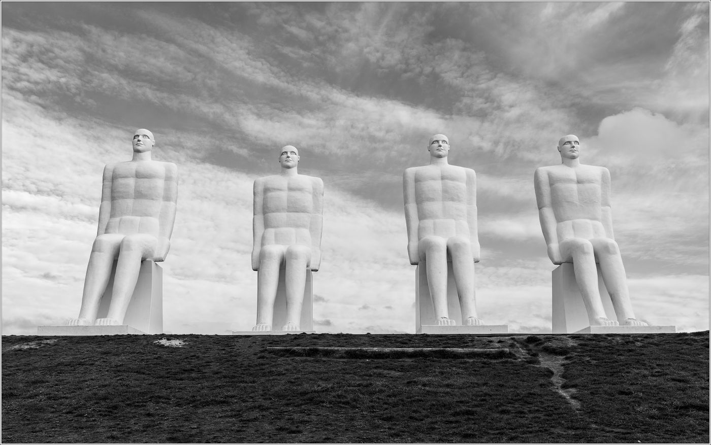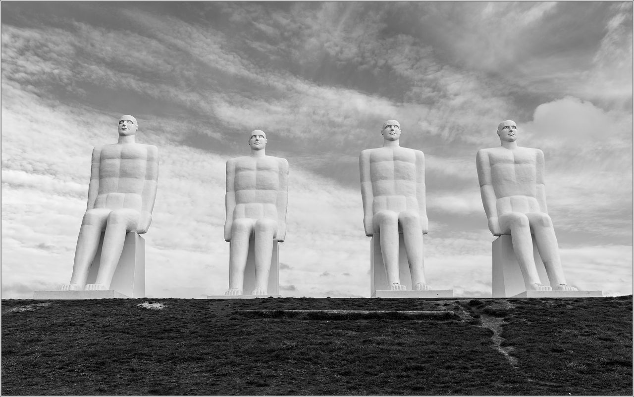 Man at Sea is a scupture outside of Esbjerg in Denmark. The scuptures are looking at the sea.